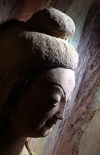 敦煌鳴沙山缺乏堅硬的巖石,所以從一開始就是泥塑。北朝時期,敦煌泥塑塑像有釋迦佛、肋侍菩薩、釋迦苦修、禪僧等題材,造型上也受犍陀羅藝術的影響。但第259窟正龕的釋迦牟 尼和多寶佛,右壁龕上的被譽為“東方蒙娜麗莎”的單身坐佛,俯身向前,含著微笑;第248窟的彩塑坐佛,衣褶流動,唇角上翹,一手拂膝,一手做手印。它們都已有中國特色。到西魏時出現了秀骨清像風格,北周后逐漸變得豐滿,到了隋唐就愈加圓潤豐肥,形成了盛唐風范。